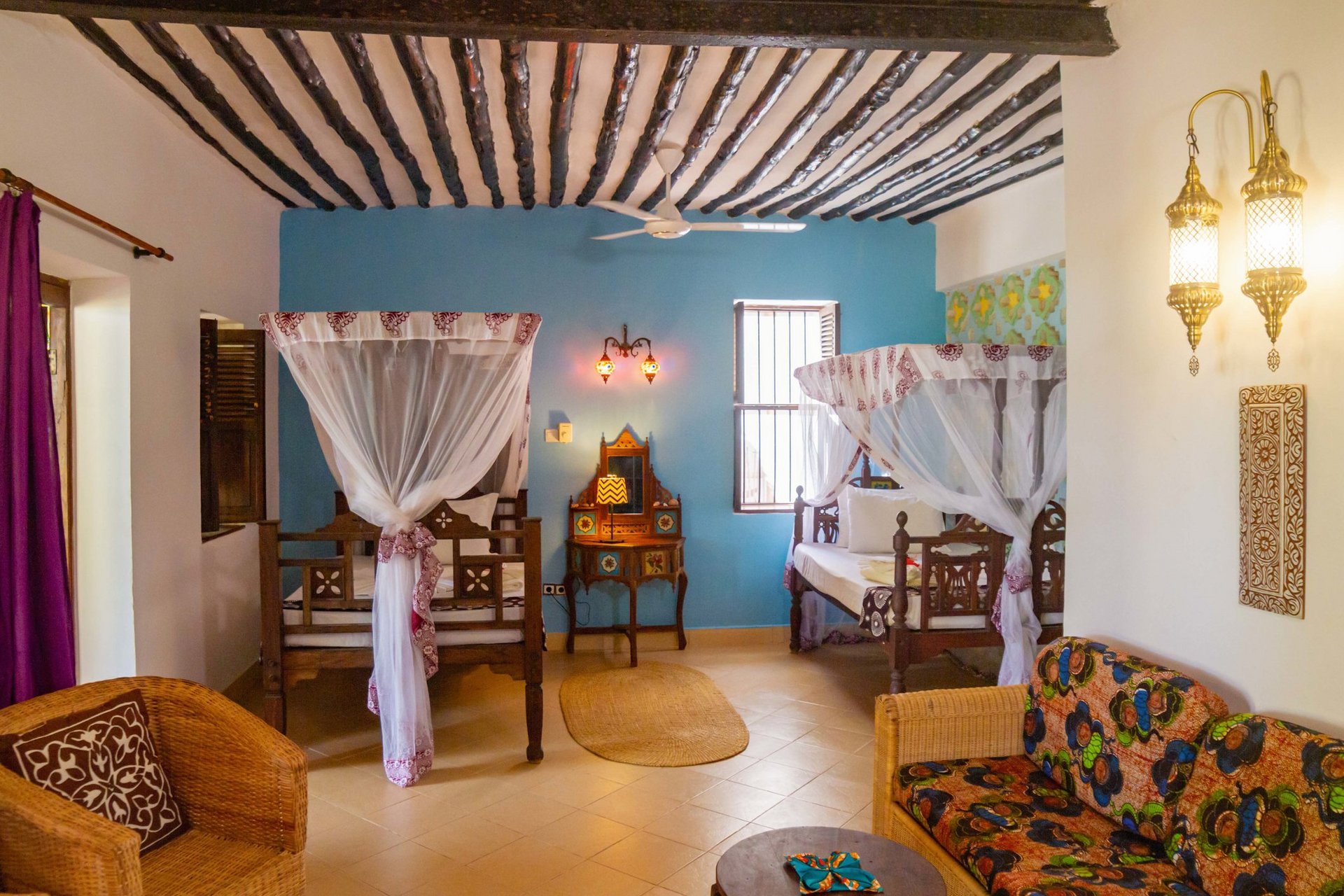 Die 4 Zimmer (Crystal Bluu, Coconut, Hibiscus und Aloe Vera) bieten mit einer Größe von 24-28 qm gut Platz für 1-2 Personen. Die 4 Zimmer befinden sich in der Villa Bahati. Alle Zimmer sind mit sansibarischen Antiquitäten eingerichtet. Die einzigartig gestalteten Steinbadezimmer mit Dusche und Handwaschbecken sind aus farbenfrohem, poliertem Terazzo gefertigt. Das Zimmer Aloe Vera verfügt über 2 Betten.