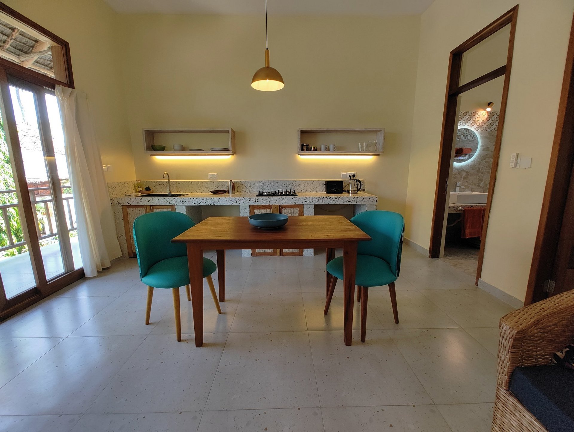Die vier Apartments (ca. 50 qm) sind im modernen afrikanischen Strandstil erbaut und verfügen über eine große offene Küche und einen Wohnbereich, ein Schlafzimmer, ein großes Badezimmer und einen Balkon oder eine Terrasse.