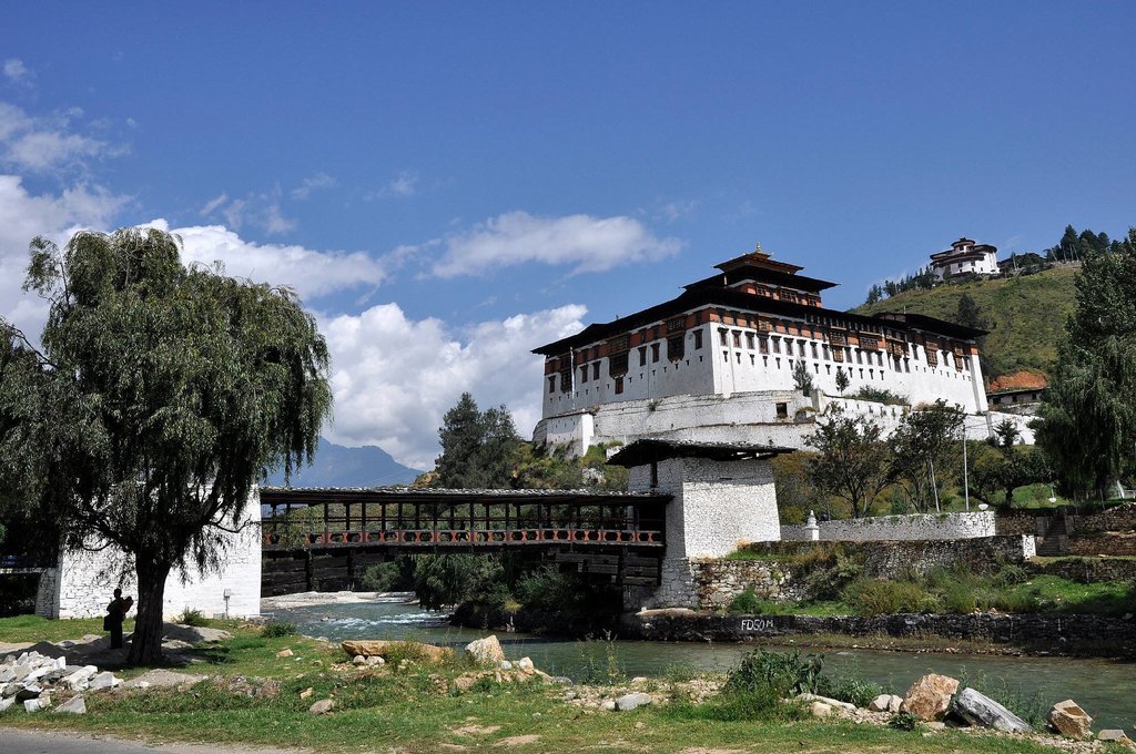 Punakha Dzong ist sicherlich eine der schönsten Klosterburgen des ganzen Landes und der einzige Dzong, der auf einer Flußinsel gebaut ist. Ein sehr mildes Klima und die beiden Flüsse Pho Cchu (der männliche Fluß) und Mo Cchu (der weibliche Fluß) lassen das fruchtbare Tal reichlich Früchte hervorbringen. In der Nähe des Dzong überspannt Bhutans längste, mit bunten Gebetsfahnen geschmückte Hängebrücke den Po Cchu. Die Begehung ist etwas wackelig, aber belohnt mit tollen Blicken.