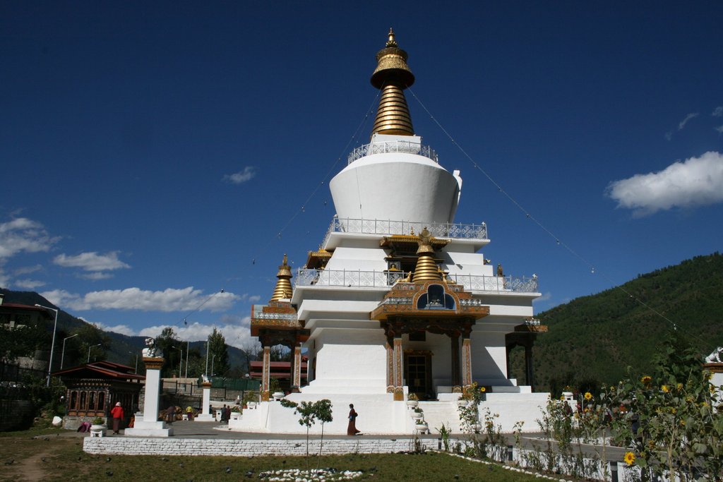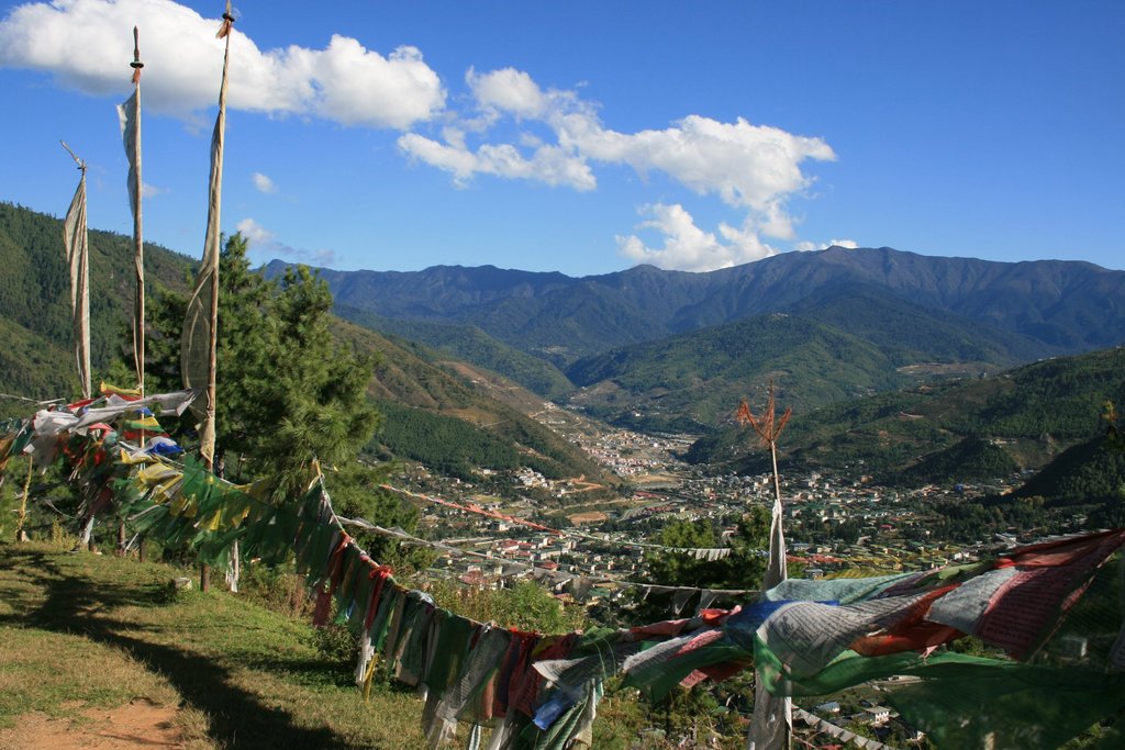 Thimphu, 2350 m hoch gelegen, hat mittlerweile weit über 80.000 Einwohner und wurde erst 1953 Hauptstadt des Landes. Obwohl die Stadt sehr schnell wächst, wird strikt auf einen traditionellen Baustil geachtet. Daher hat Thimphu ein typisch bhutanisches Aussehen, das nicht, wie vielerorts auf der Welt, durch moderne Architektur getrübt wird.