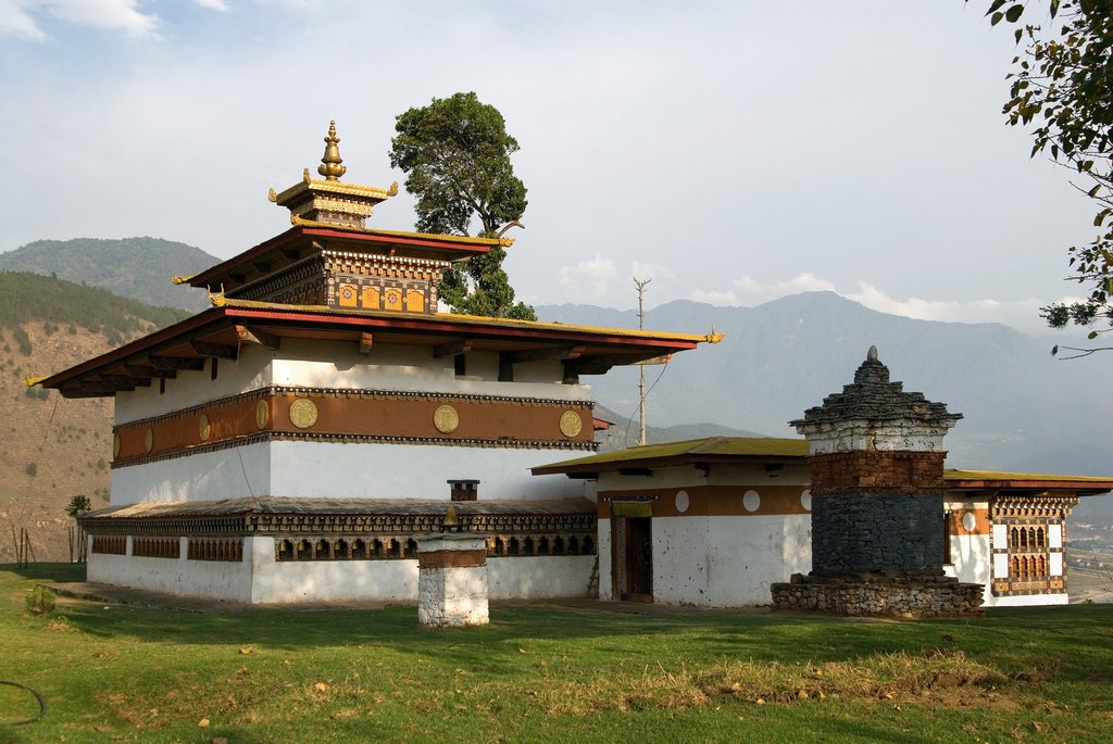 Der Weg beginnt an dem mit Gebetsfahnen bunt geschmückten Radio Tower (2.818m) über Thimphu, wo Sie unzählige bunt flatternde Gebetsfahnen empfangen. Nach ca. 1 Std. erreichen Sie das kleine Kloster Chhokhortse (3.010m), ein Retreat Center für Mönche. Oberhalb des Klosters, der Weg führt noch immer steil bergauf, treffen Sie auf einen großen Chorten (ca. 3.400m). Immer weiter bergauf führt der Pfad, und nach ca. 4 schweißtreibenden Stunden erreichen Sie den Kloster-Komplex von Phajoding (3.690m), der ideale Ort, um die Lunch Pakete auszupacken und die Aussicht über Thimphu aufzusaugen. Verschiedene Gebäude und Meditationszellen sind am verstreut und ein kurzer Besuch im alten Hauptkloster lohnt sich.