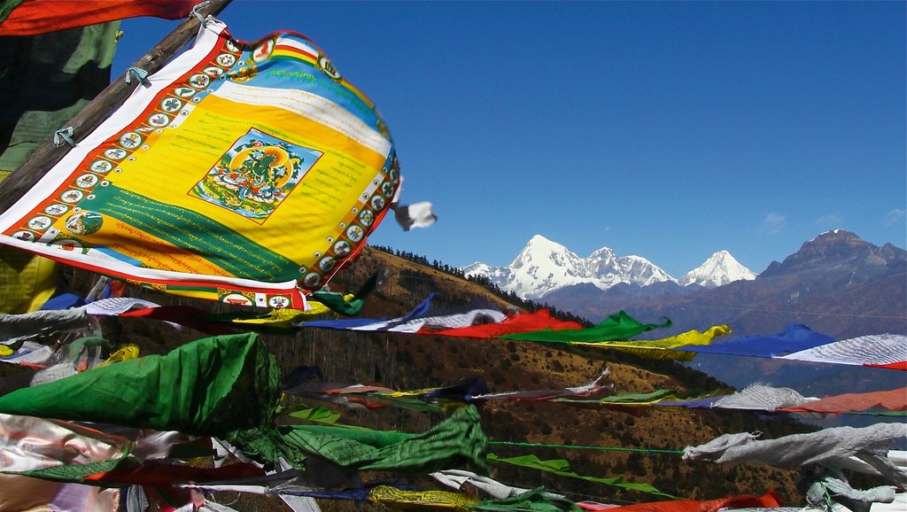 Ab dem Kloster geht er Pfad weiter bergauf zum flaggengeschmückten Dochu La Pass (4.100m) (nicht zu verwechseln mit dem gleichnamigen Pass zwischen Thimphu und Punakha). Bei gutem Wetter schweift Ihr Blick weit über die Berge und Täler Zentralbhutans bis zu Bhutans höchstem Berg, den Gangkar Puensum (7.546m).