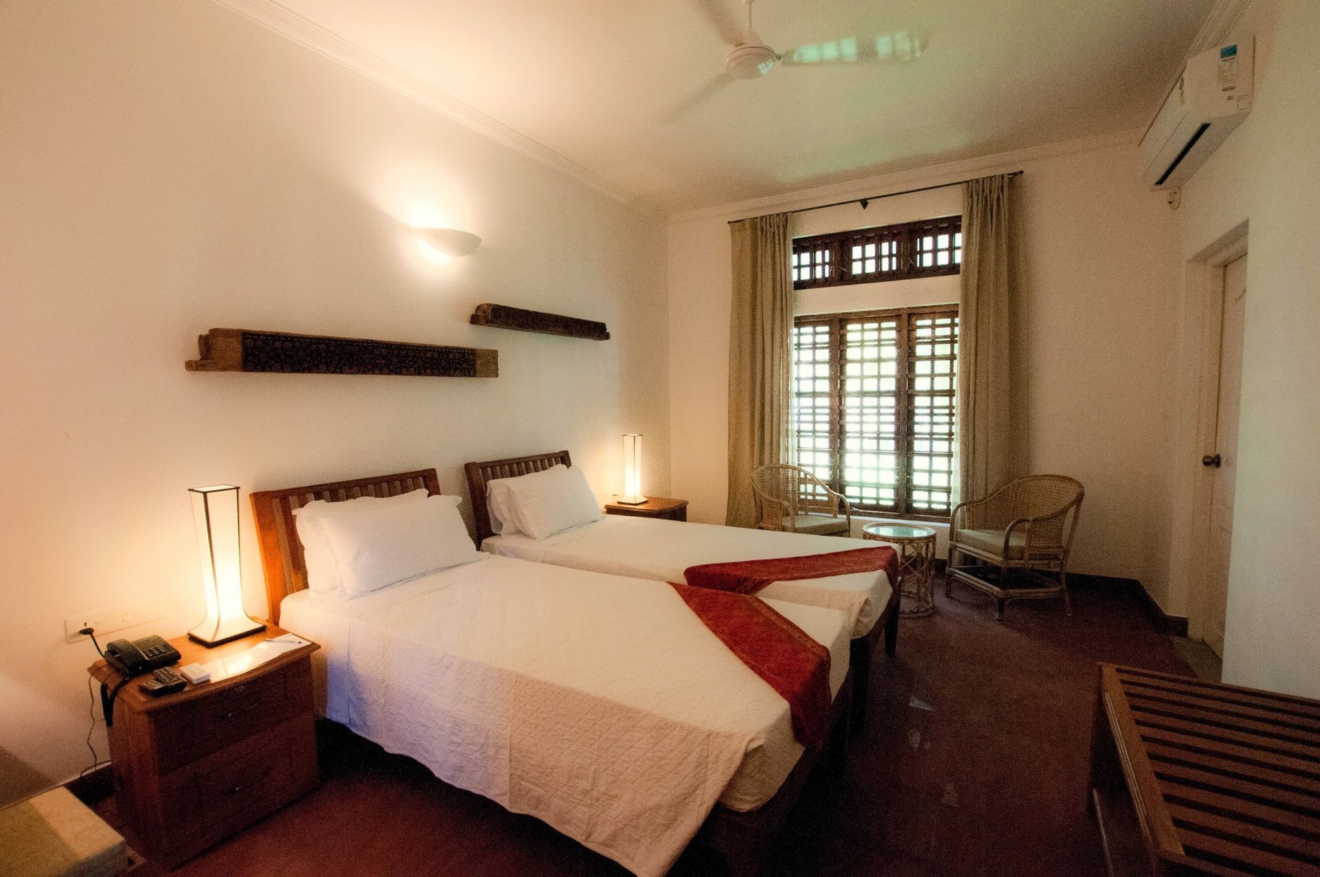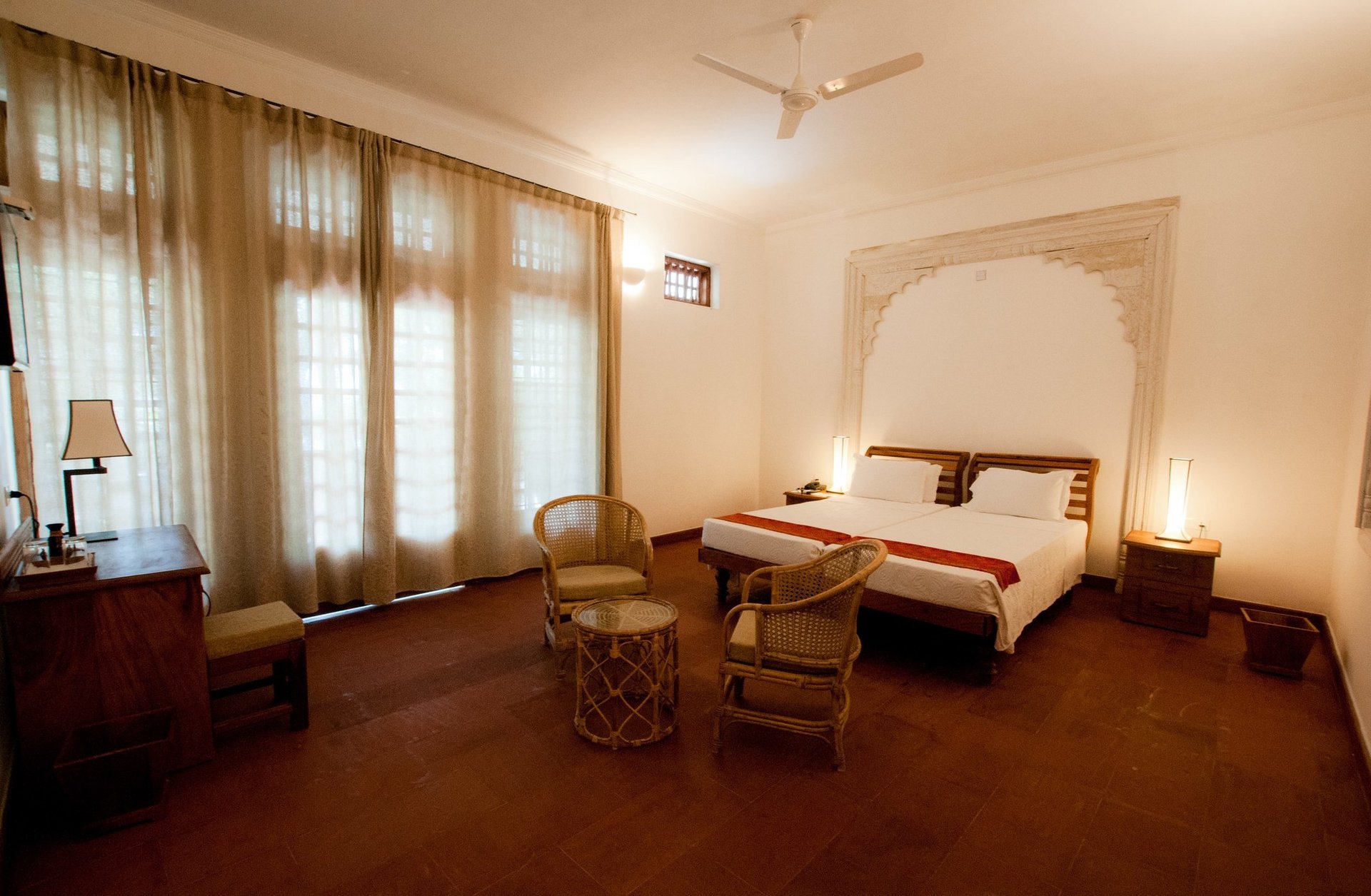 Die Zimmer zur Gartenseite Zimmer (ca. 25 qm) sind im keralischen Stil geschmackvoll mit ausgesuchten handverlesenen Antiquitäten eingerichtet. Die Bäder haben eine Walk-In Dusche/WC und einen Föhn. Die Zimmer verfügen über Telefon, WLAN, Sat.-TV, individuell regulierbare Klimaanlage, Ventilator sowie eine Sitzgelegenheit und einen Schreibtisch.