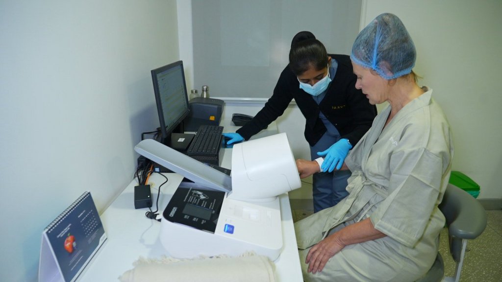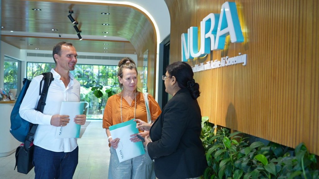 In der NURA-Klinik in Bangalore durchlaufen Sie ein umfassendes Gesundheits-Screening nach japanischem Vorbild. Innerhalb von 120 Minuten werden bis zu 28 Parameter erfasst – darunter Herz-Kreislauf-Funktion, Leber, Niere, Schilddrüse, Stoffwechsel sowie ein Screening auf die häufigsten Krebsarten. Die Untersuchungen erfolgen mit Ultra-Low-Dose-CT, digitaler Mammographie, Knochendichtemessung und Bluttests ohne vorheriges Fasten. KI-gestützte Bildanalyse von Fujifilm erhöht die Präzision bei minimaler Strahlenbelastung. Im Anschluss bespricht ein Arzt oder eine Ärztin alle Ergebnisse persönlich mit Ihnen. Die schriftlichen Befunde nehmen Sie mit zu Ihrer Ayurveda-Kur. Bitte beachten Sie, dass alle Gespräche ausschließlich auf Englisch stattfinden.