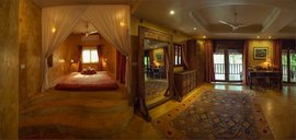 Die Shahi Suite ist mit ihren 120 m2 die größte Suite im Ashiyana . Große, französische Fenster führen zu einem umlaufenden Balkon. Genießen Sie von den kunstvoll geschnitzen Holz-Tagesbetteen aus den außergewöhnlichen Blick auf den Fluss Mandrem und den üppigen Garten. Im Inneren schaffen antike rajasthanische Holzmöbel ein heimeliges Gefühl, mit einem prächtigen geschnitzten Spiegel neben dem geschlossenen Schlafbereich. Das geräumige Badezimmer bietet sowohl eine Dusche als auch eine runde Badewanne. Weiterhin verfügt die Shahi Suite über eine Klimaanlage, mehrere Ventilatoren und Wifi.