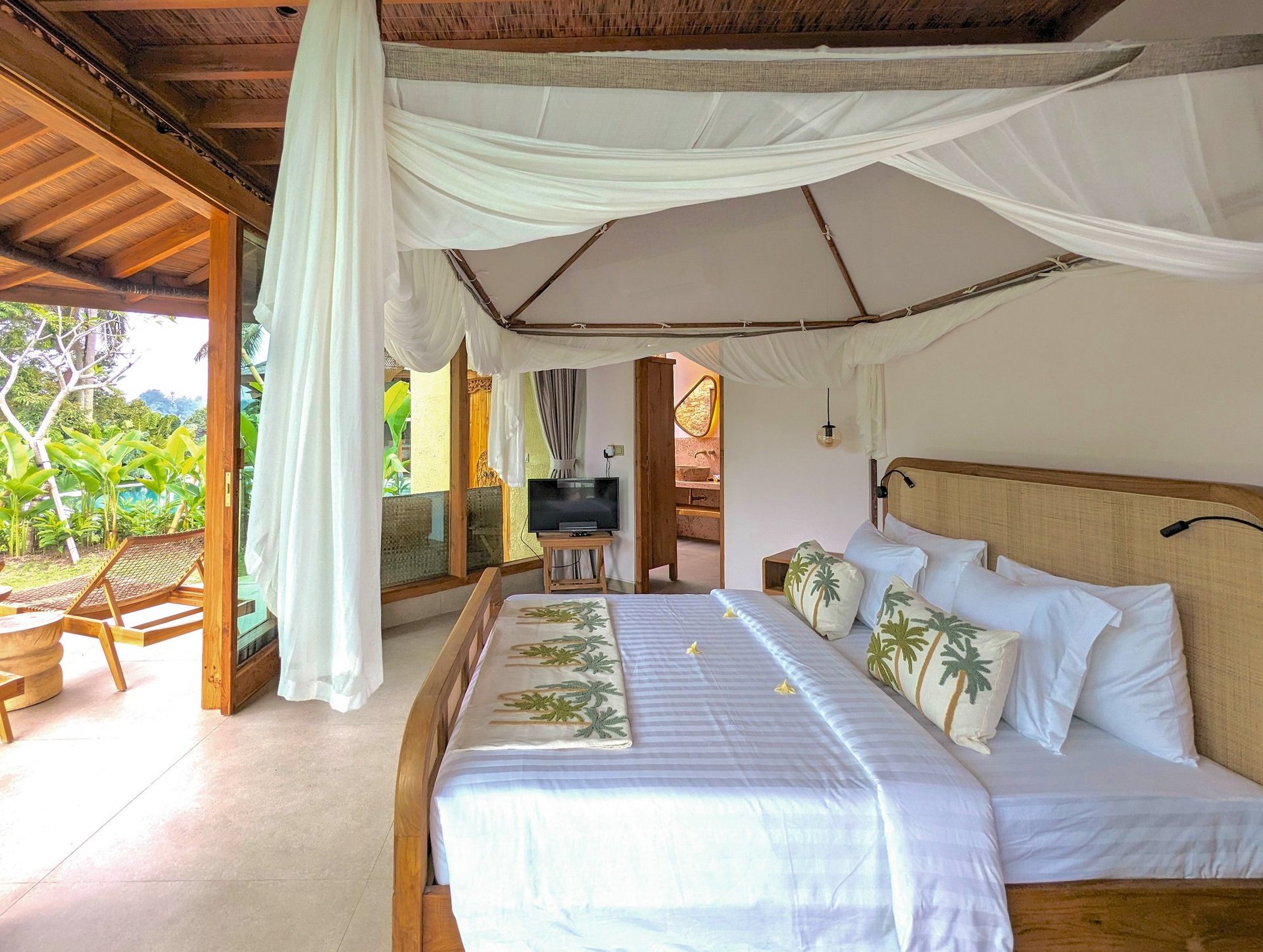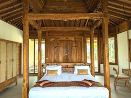 Die Besonderheit der Joglo-Zimmer (5) ist die beeindruckende Architektur durch die aufwendigen Schnitzereien über dem Bett. Von dem Balkon aus eröffnet sich Ihnen ein atemberaubendes Panorama auf die grünen Reisfelder mit majestätischen Vulkanen im Hintergrund. Die Joglo-Schlafzimmer bieten Platz für bis zu 3 Personen (ca. 75 qm).