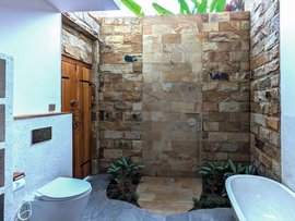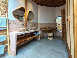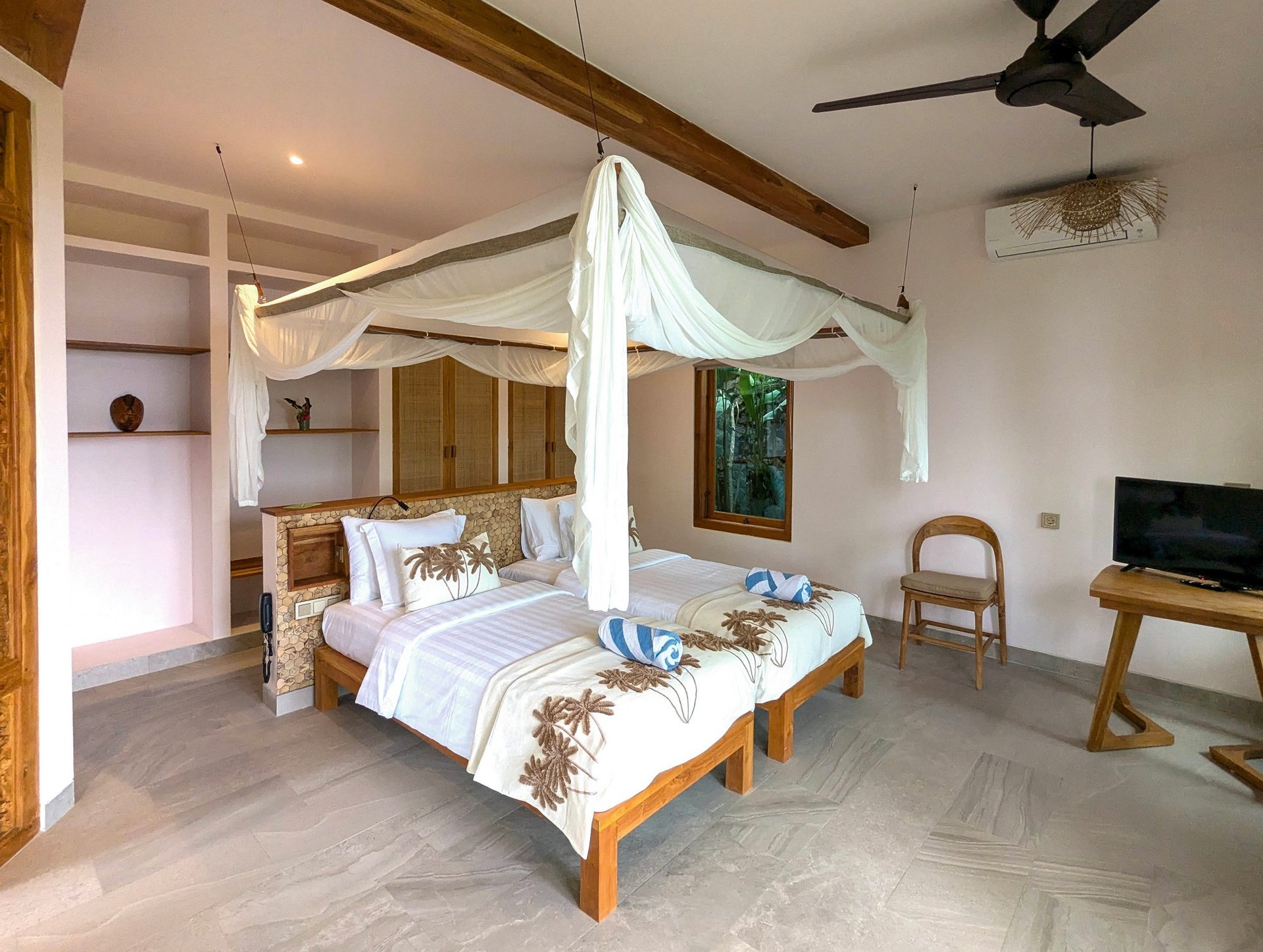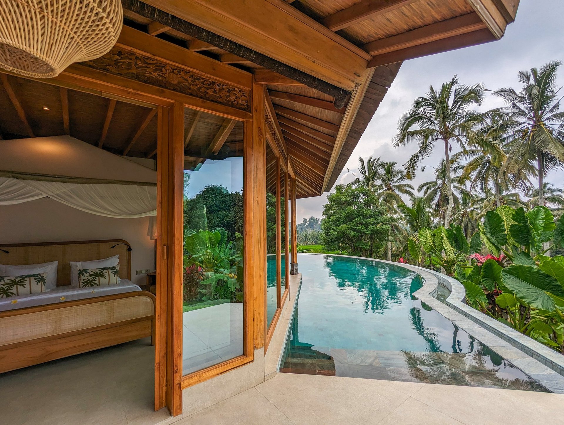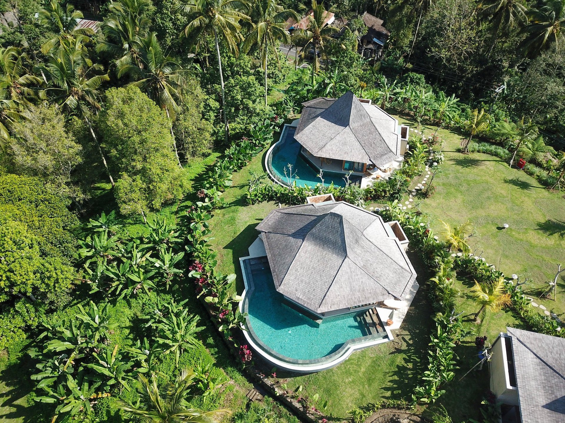 Die 2 Villen verfügen über je zwei Schlafzimmern, ein geräumiges Wohnzimmer, einer gut ausgestatteten Küchenzeile und zwei luxuriösen Badezimmern. Das Highlight ist der weitläufige private Pool, der sowohl vom Wohnzimmer als auch von den Schlafzimmern aus zugänglich ist. Hier genießen Sie die Natur Balis in aller Ruhe. Eine Villa bietet Platz für bis zu 6 Personen (ca. 124m²).