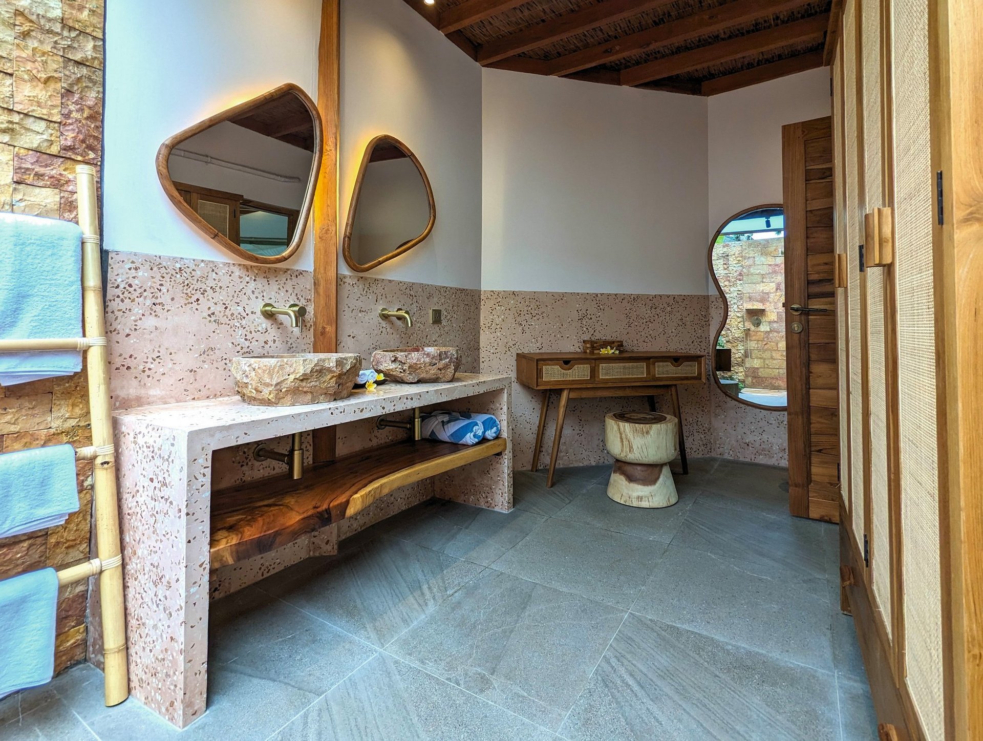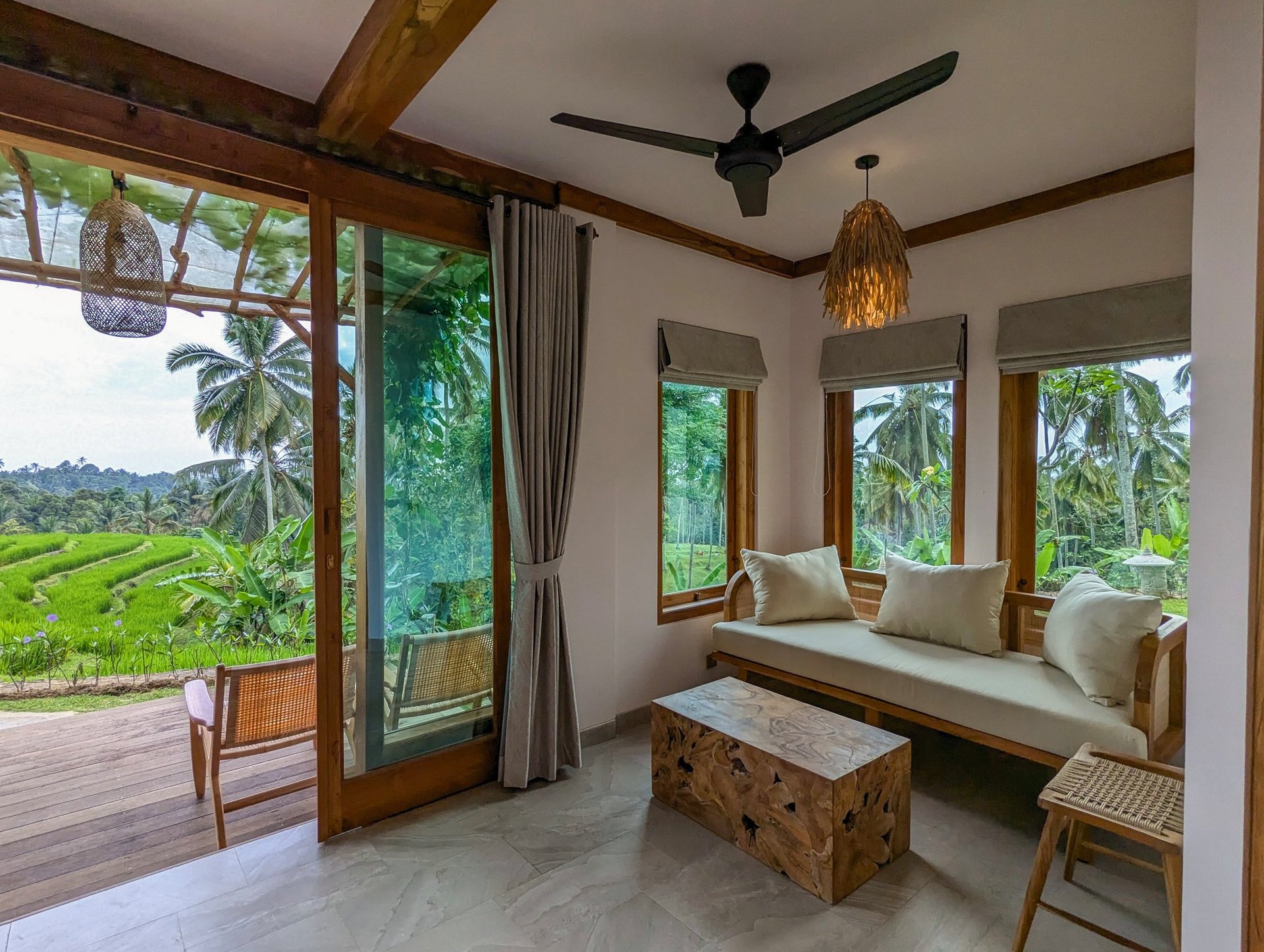 Es ist ein kleines Boutique Resort mit 14 Zimmern: 5 Joglo Zimmer, 5 Sawah Zimmer und 4 Zimmer aufgeteilt in 2 Villen mit privatem Pool. Die Zimmer sind auf zwei Etagen gebaut - der traditionell gestaltete Joglo-Raum befindet sich im Obergeschoss und das moderne Sawah-Zimmer im Erdgeschoss.