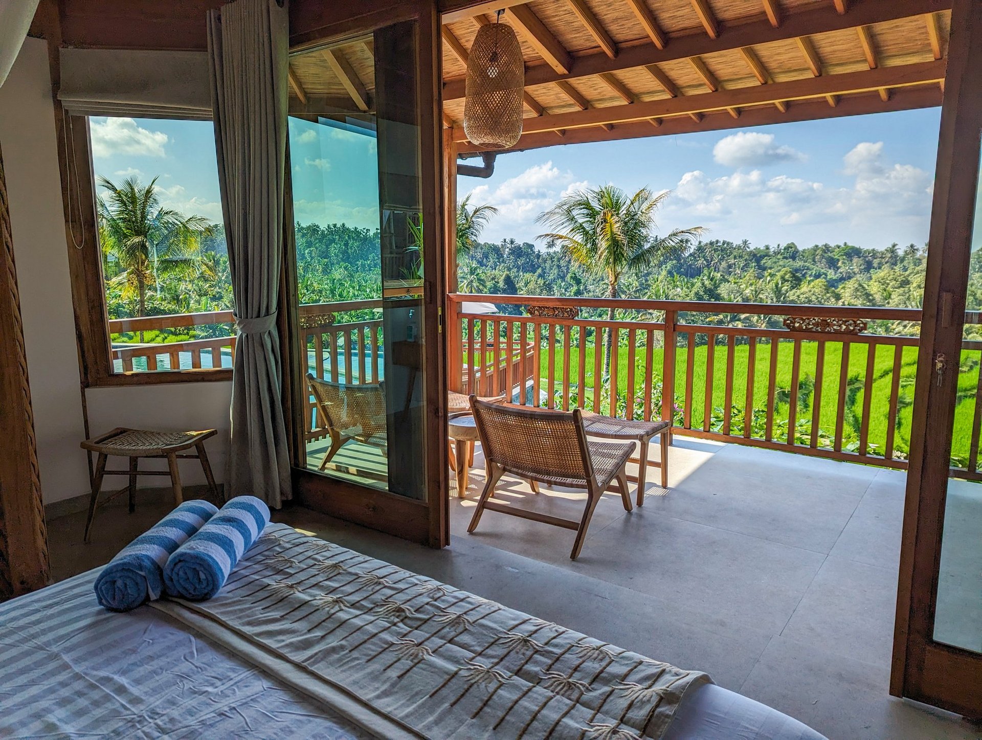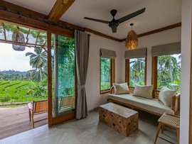 Genießen Sie den Ausblick auf die terrassenförmig angelegten Reisfelder bis hin zu den beeindruckenden umliegenden Vulkangipfeln und lassen Sie es sich mit Yoga & Massagen gut gehen.
