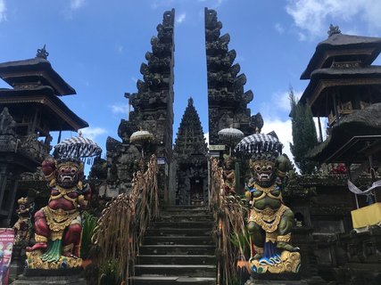 Ein Highlight war dann nach dem Besuch einer Kaffeeplantage unsere Einkehr ins „Bali Asli“, einem Restaurant inmitten von Reisterrassen mit Blick auf den Vulkan Agung, der sich uns nach anfänglicher Verhüllung in Wolken noch in seiner vollen Pracht zeigte. Was uns hingegen verwehrt blieb ist Ogoh-Ogoh, die traditionellen Umzüge mit lärmenden Musikinstrumenten an Neumond, bei dem riesige Figuren durch die Strassen getragen und schließlich am Meer verbrannt werden. Sinn dieser Zeremonie ist die Verbannung aller bösen Geister aus den Dörfern und dem Leben gläubiger Balinesen, um wieder das Gleichgewicht zwischen Menschen, Göttern und der Natur herzustellen. (Vielleicht gar keine so schlechte Idee…?)