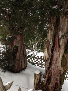 Der erste Tag stand im Zeichen des Ankommens. Nina, Burkhard und Matthias lockte es sofort, die mitgebrachten Langlaufski auszuprobieren. Sie kamen mit roten Wangen und begeistert von der ersten Tour zufrieden abends ins Yoga. Wir anderen machten einen gemütlichen Schneespaziergang und freuten uns wie Kinder durch das manchmal tiefe Weiß zu stapfen und Schneeflocken auf der Haut zu spüren. Wir begegneten dabei der alten Eibe, die aus einer anderen Zeit stammt und wohl schon etwa 2000 Wintern getrotzt hat.
