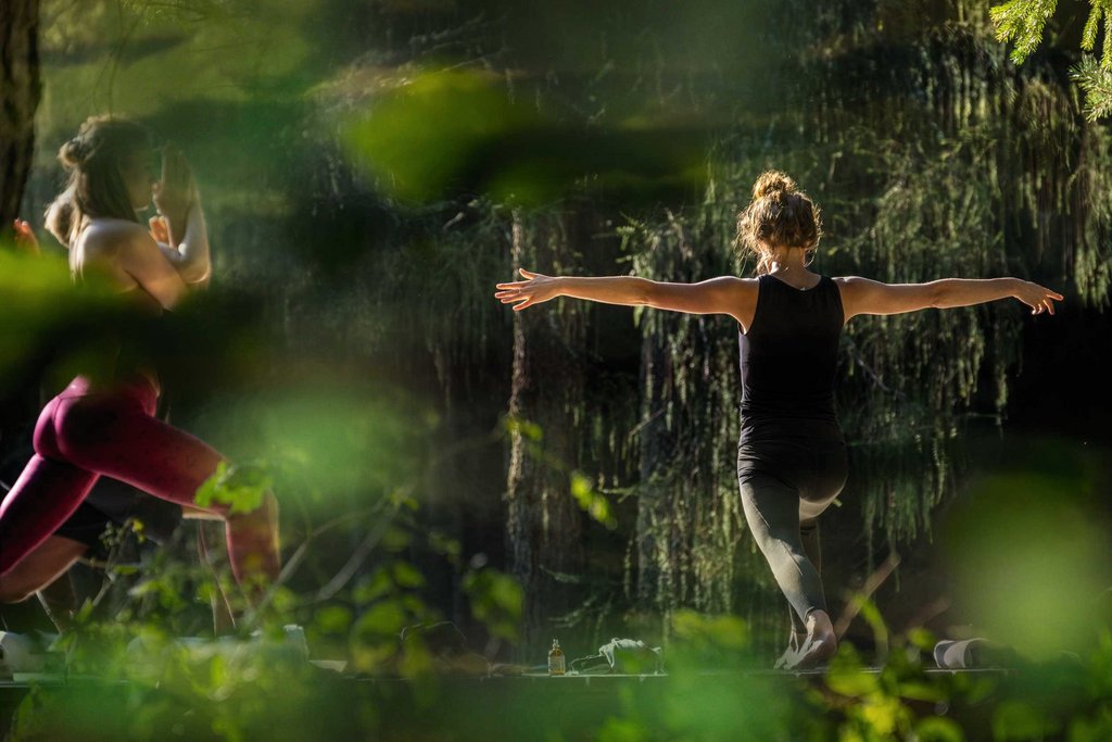 Am Nachmittag folgt eine zweite, 120-minütige Yogaeinheit – wahlweise in den lichtdurchfluteten Räumen oder auf der Yoga-Plattform mitten im Wald.