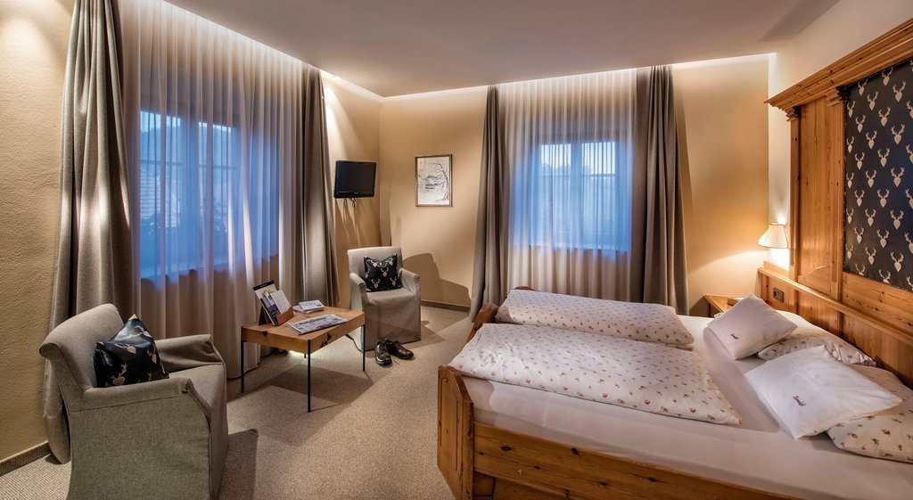 Die Classic Doppelzimmer mit Balkon sind etwa 23 qm groß. Sie verfügen zum Teil über Holzfußboden oder Teppichboden und haben teilweise Dachschrägen und Holzdecken. Jedes Zimmer ist individuell gestaltet und unterscheidet sich im Stil und Charakter. Ausgestattet sind alle Zimmer mit einem eigenen Bad mit Dusche/WC und Haartrockner, Sat-TV, Telefon, Safe, Kosmetikspiegel, Saunahaus-Tasche mit Handtüchern und Bademantel sowie WLAN. Das Doppelzimmer kann auch zur Alleinnutzung gebucht werden. (Beispielbild)