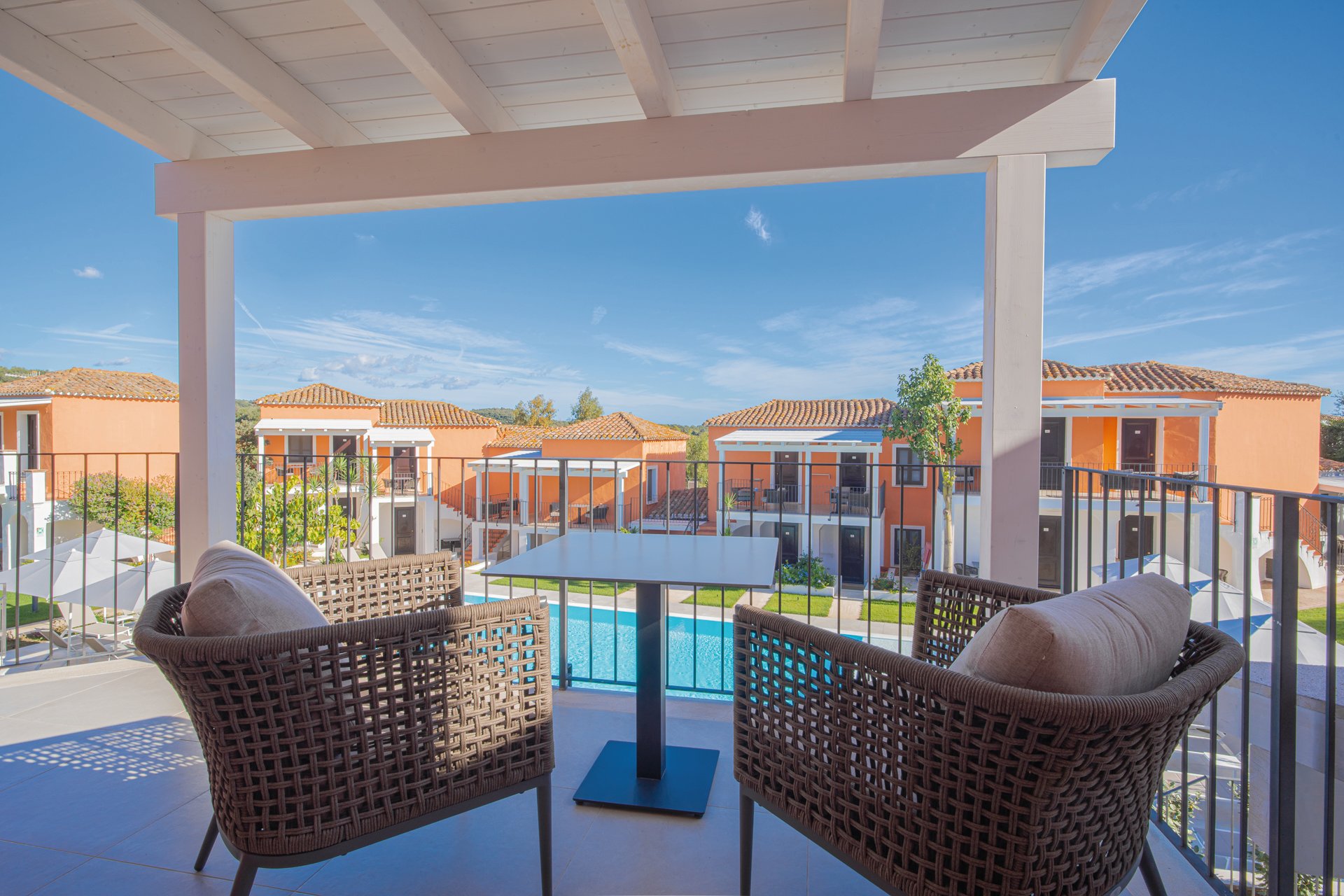Die Pool-Zimmer liegen im Garten, um den neuen Poolbereich. Auch sie sind etwa 22 qm groß und im sardischen Stil eingerichtet mit auf der Insel angefertigten Möbeln und Stoffen. Es steht eine private oder gemeinsam nutzbare Loggia oder Terrasse mit Sitzmöglichkeit zur Verfügung. Die Zimmer sind ausgestattet mit einem eigenen Bad mit Dusche und WC sowie Klimanlage, Minibar, Kaffeemaschine, Sat-TV, Safe und Haartrockner. Das Doppelzimmer kann auch zur Alleinnutzung gebucht werden. (Beispielbild)