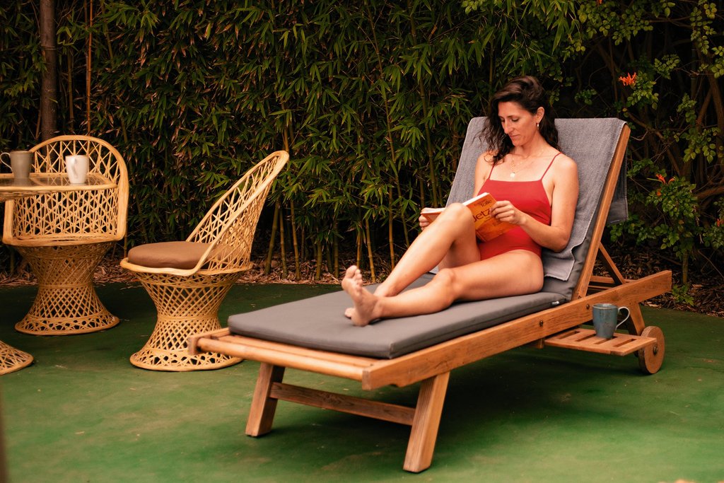 Nach Ihren ayurvedischen Anwendungen steht Ihnen die originale finnische Außensauna mit Holzfeuerung zur Verfügung – auf Anmeldung und gegen Aufpreis. Ihre Hitze zieht tief in die Muskeln, die heiße Außendusche unter freiem Himmel rundet das Erlebnis ab. Auf der Yogawiese vor dem Yogaraum dürfen Sie sich auch außerhalb der Übungszeiten hinlegen und den Himmel betrachten. Der beheizbare Pool lädt zur Entspannung ein. Überall im terrassierten Garten finden sich geschützte Plätze zum Verweilen – zwischen Palmen und Obstbäumen, an denen Sie ganz bei sich ankommen können, ohne etwas tun zu müssen.