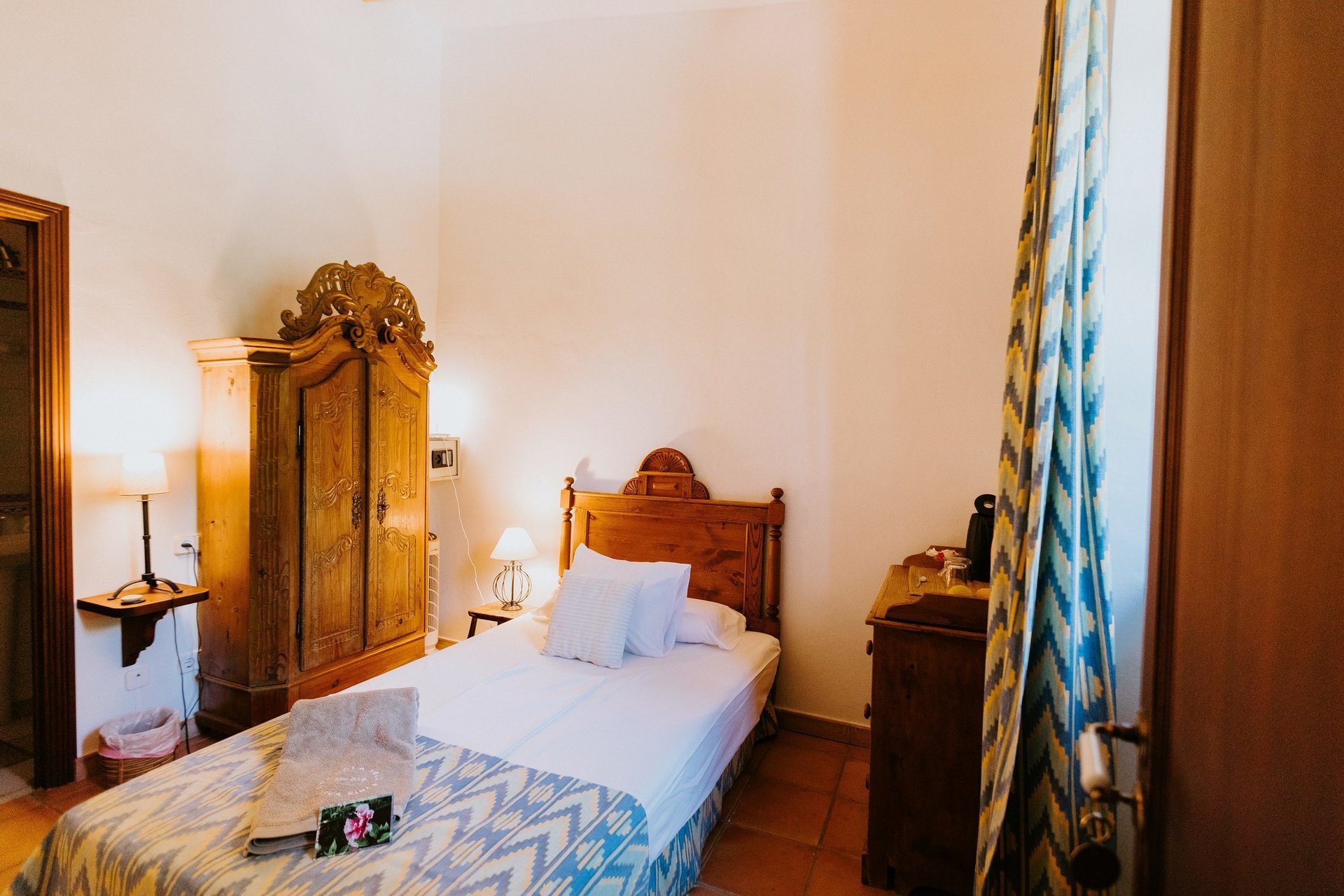 Dieses Einzelzimmer liegt im ersten Stock des Haupthauses über der Restaurant-Terrasse und verfügt über ein eigenes Bad mit Föhn. Shampoo und Duschgel sind vorhanden. Das Bett ist 1,40m breit und die Fenster öffnen sich in Richtung Garten mit entferntem Blick aufs Meer. Diese Kategorie verfügt über keinen Balkon oder Terrasse. Zu den Annehmlichkeiten gehören Safe, Wasserkocher, Thermoskanne und Teebeutel, ebenso wie eine Pool-Tasche mit Bademantel und Pool-Handtuch. Im Juli und August ist die Nutzung der Zimmerkühlung kostenfrei, in den anderen Monaten kann diese gegen eine Gebühr von 50 Euro vor Ort hinzugebucht werden.